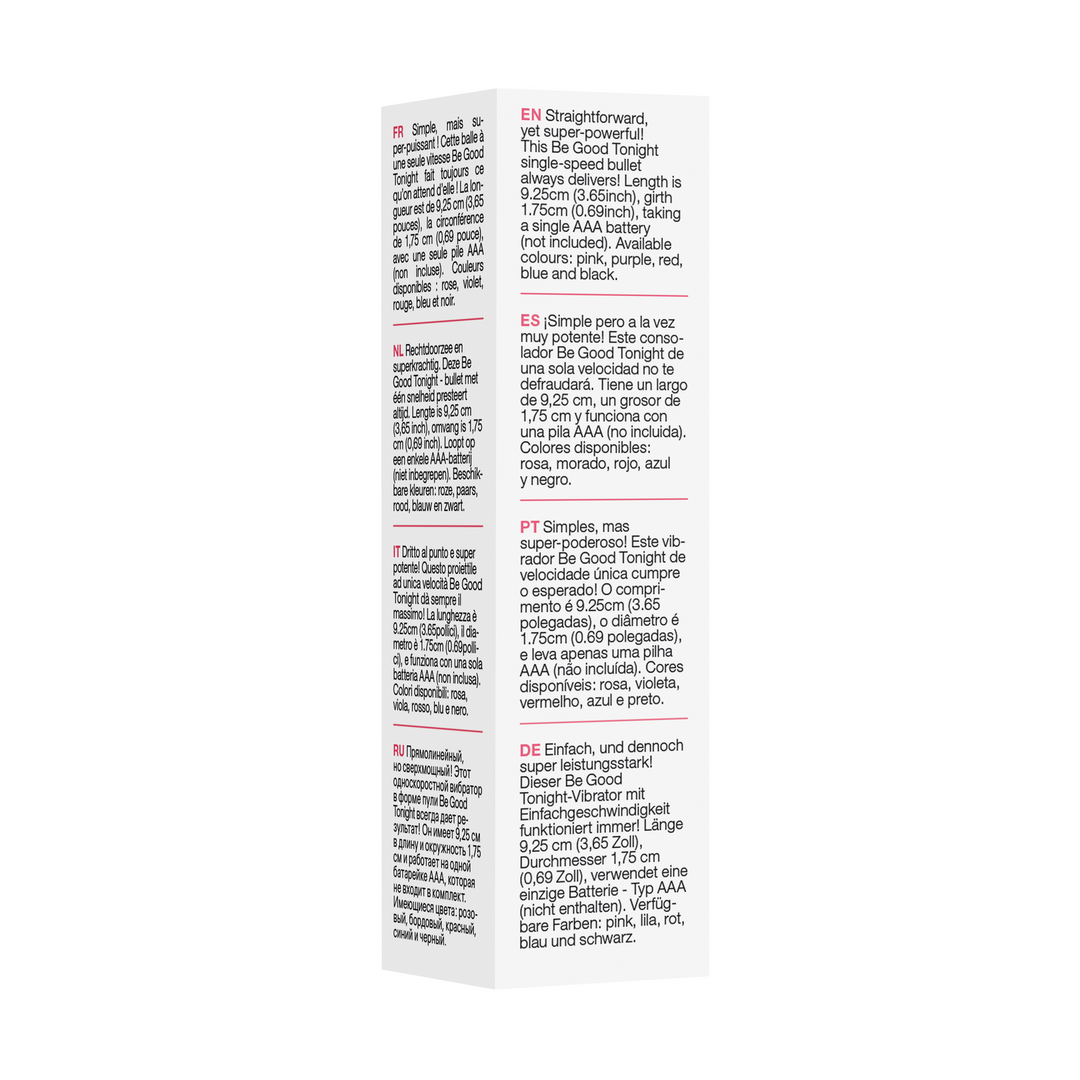 Rechtdoorzee ensuperkrachtig. Deze BeGood Tonight – bullet metéén snelheid presteertaltijd. Lengte is 9,25 cm(3,65 inch), omvang is 1,75cm (0,69 inch). Loopt opeen enkele AAA-batterij(niet inbegrepen). Beschikbarekleuren: roze, paars,rood, blauw en zwart.