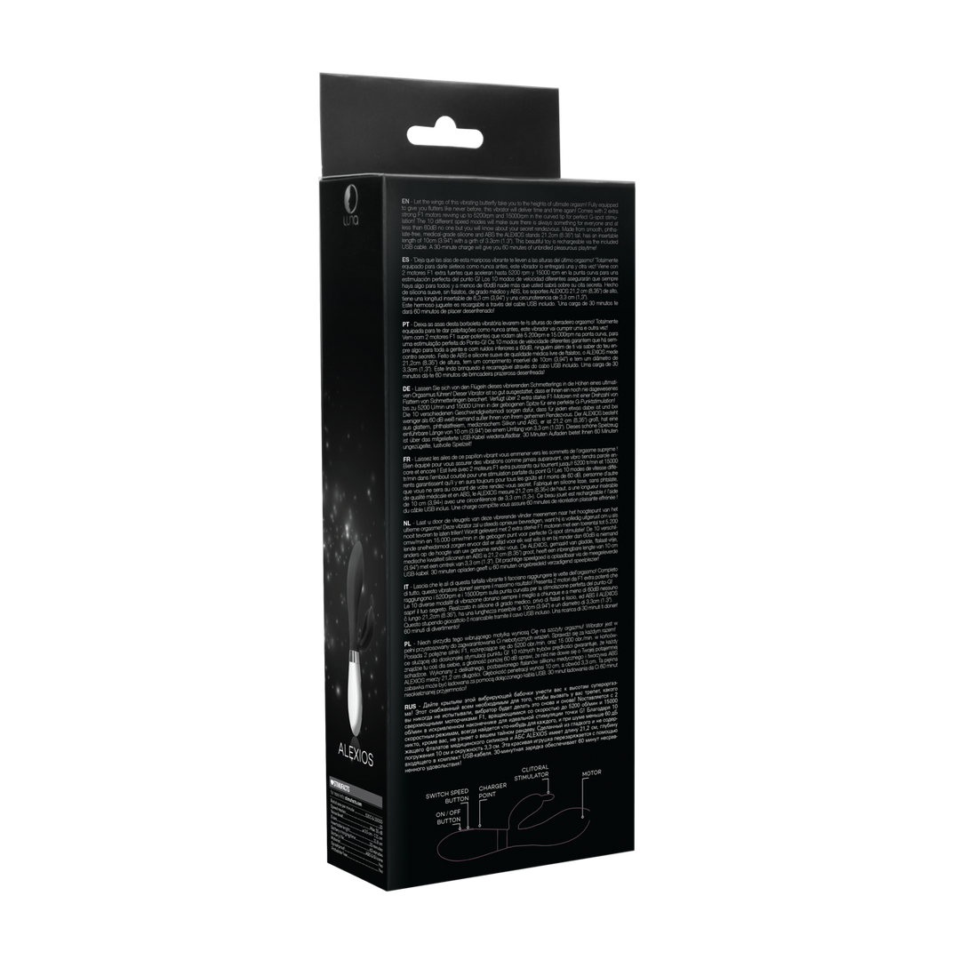 Laat u door de vleugels van deze vibrerende vlinder meenemen naar het hoogtepunt van hetultieme orgasme! Deze vibrator zal u steeds opnieuw bevredigen, want hij is volledig uitgerust om u alsnooit tevoren te laten trillen! Wordt geleverd met 2 extra sterke F1 motoren met een toerental tot 5.200omw/min en 15.000 omw/min in de gebogen punt voor perfecte G-spot stimulatie! De 10 verschillendesnelheidsmodi zorgen ervoor dat er altijd voor elk wat wils is en bij minder dan 60dB is niemandanders op de hoogte van uw geheime rendez-vous. De ALEXIOS, gemaakt van gladde, ftalaat-vrije,medische kwaliteit siliconen en ABS is 21,2 cm (8.35”) groot, heeft een inbrengbare lengte van 10 cm(3.94”) met een diameter van 3,3 cm (1.3”). Dit prachtige speelgoed is oplaadbaar via de meegeleverdeUSB-kabel. 30 minuten opladen geeft u 60 minuten ongebreideld verzadigend speelplezier!