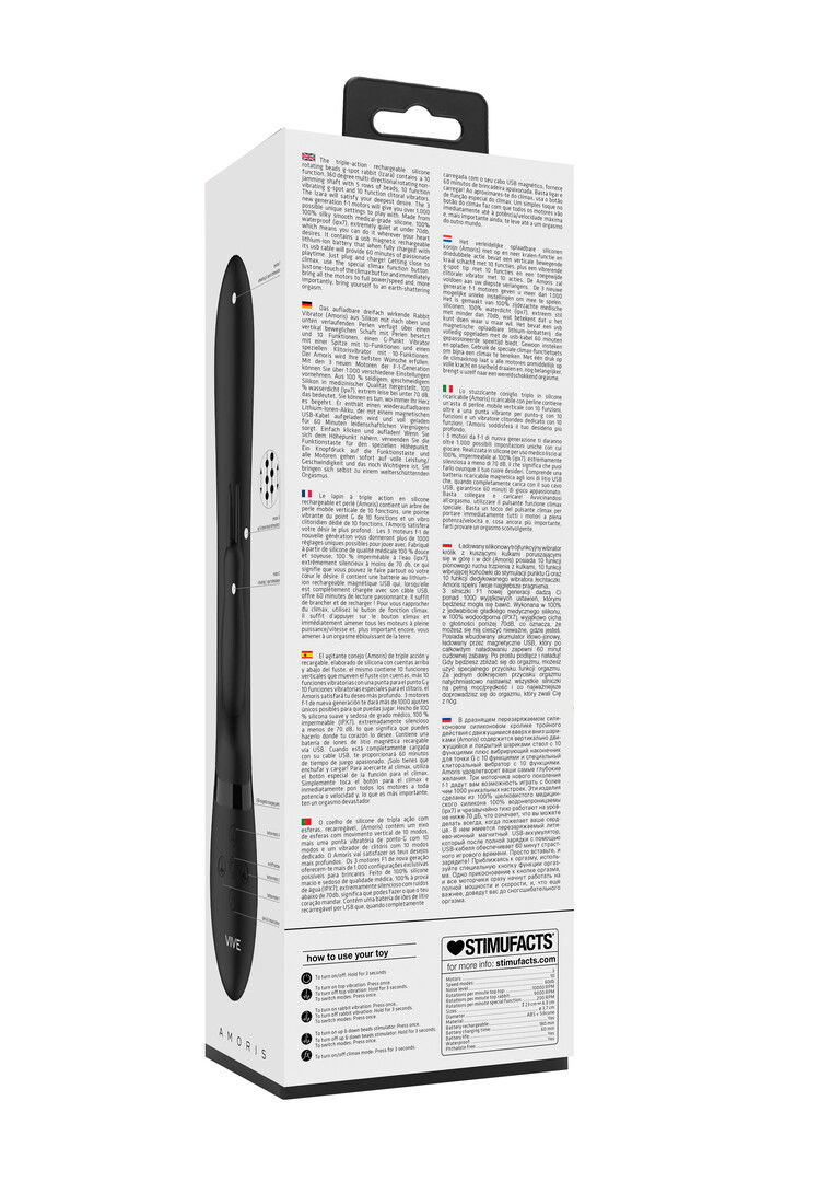 De AMORIS is een zinnenprikkelende, verticaal-bewegende “rabbit-vibrator, uitgerust met stimulerende kralen. Met een verticaal bewegende kralen-schacht voorzien van 10 bewegingspatronen, een vibrerende G-spot tip met 10 verschillende functies en een specifieke clitoris-vibrator óók voorzien van 10 functies, zal de AMORIS zeker aan al je seksuele behoeftes voldoen. De 3 motoren bieden je 1000 unieke vibratie- instellingen en bewegingspatronen om uit te kiezen.De AMORIS is gemaakt van 100% medisch kwalitatieve en zijdezachte siliconen, is 100% waterdicht (ipx7) en extreem stil bij minder dan 70 dB, wat betekent dat je hem (bijna)overal kunt gebruiken waar je hartje begeert.Hij bevat een oplaadbare li-ionbatterij die, wanneer volledig opgeladen, 60 minuten gepassioneerde speeltijd zal bieden. Klik de bijgesloten USB kabel op het magnetische aansluitpunt en hij laadt op!Wanneer je hoogtepunt nadert, zal één druk op de speciale “climax-knop onmiddellijk alle motoren op volle kracht / snelheid zetten en, nog belangrijker, je naar een wereldschokkend orgasme voeren.