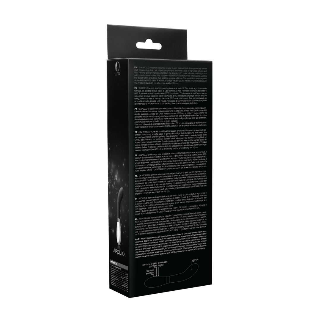 De APOLLO is speciaal ontworpen voor het genot van uw G-spot. Met zijn ergonomisch gevormdeschacht weet hij precies het juiste plekje te raken, en meer. Gemaakt van hoogwaardig siliconeen ABS. De ultrasterke F1-motor, die met een indrukwekkende 5200 omw/min kan draaien,zorgt ervoor dat u niet alleen in stijl komt, maar ook in stijl toekomt! Dankzij de 10-snelheidsmodiwaaruit u kan kiezen zal er altijd wel een instelling zijn die doet wat goed voelt en met minder dan55dB zal niemand anders het weten.Dit prachtige speelgoed is oplaadbaar via de meegeleverdeUSB-kabel. 30 minuten opladen geeft u 60 minuten ongebreideld plezier! De APOLLO heeft eenlengte van 21 cm en een diameter van 3,6 cm.