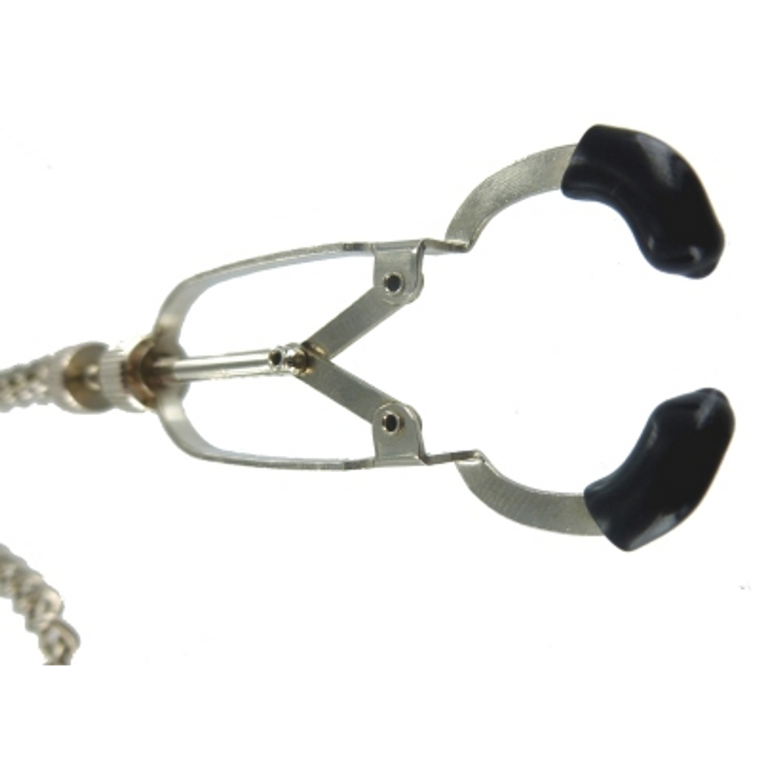De Bauhaus Nipple Vice is ontworpen voor precisie en kracht en komt naar u toe met twee klemmen die kunnen worden aangepast aan het gewenste niveau van strakheid met de stelschroeven aan de basis. De tips zijn bedekt met zacht TPR met de toevoeging van een delicate curve helemaal aan het einde die helpt bij het vastgrijpen van de huid van uw onderwerp. Het einde van dit indrukwekkende stuk is de toevoeging van een 12-inch verbindingsketting die er zo aanlokkelijk uitziet als hij aan de tepels van je speeltje hangt.
