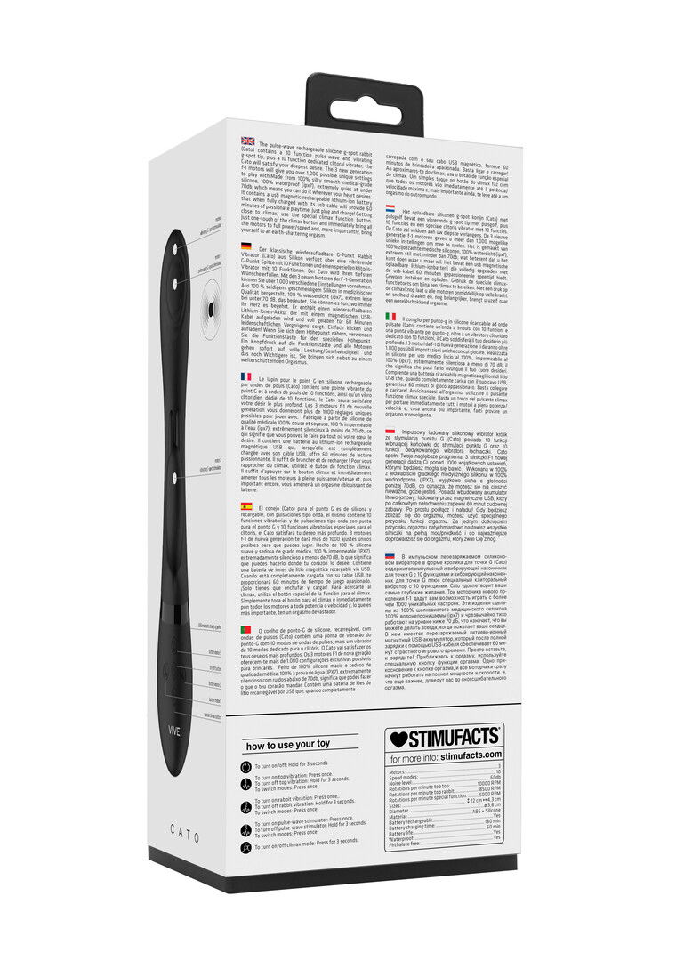 VIVE is een nieuw fenomeen op het gebied van luxueus erotisch ?speelgoed?.De CATO is een speciale pulsgolf, G-spot, ?rabbit?-vibrator en heeft een vibrerende G-spot tip met 10 functies, een speciale clitorale vibrator met 10 functies en 10 verschillende ?pulse? functies. De 3 motoren geven je meer dan 1000 mogelijke unieke instellingen om mee te spelen, waardoor je keuzes te over hebt. De CATO is gemaakt van 100% medisch kwalitatieve zijdezachte siliconen, 100% waterdicht (ipx7) en extreem stil bij minder dan 70 db, wat betekent dat je hem (bijna) overal kunt gebruiken waar je hartje begeert. Hij bevat een li-ionbatterij die, wanneer volledig opgeladen, 60 minuten hartstochtelijke speeltijd zal bieden.Klik de bijgesloten USB kabel op het magnetische aansluitpunt en hij laadt op! Wanneer een climax nadert, zal één druk op de speciale functie climax-knop onmiddellijk alle motoren op volle kracht / snelheid brengen en, nog belangrijker, je naar een wereldschokkend orgasme voeren.