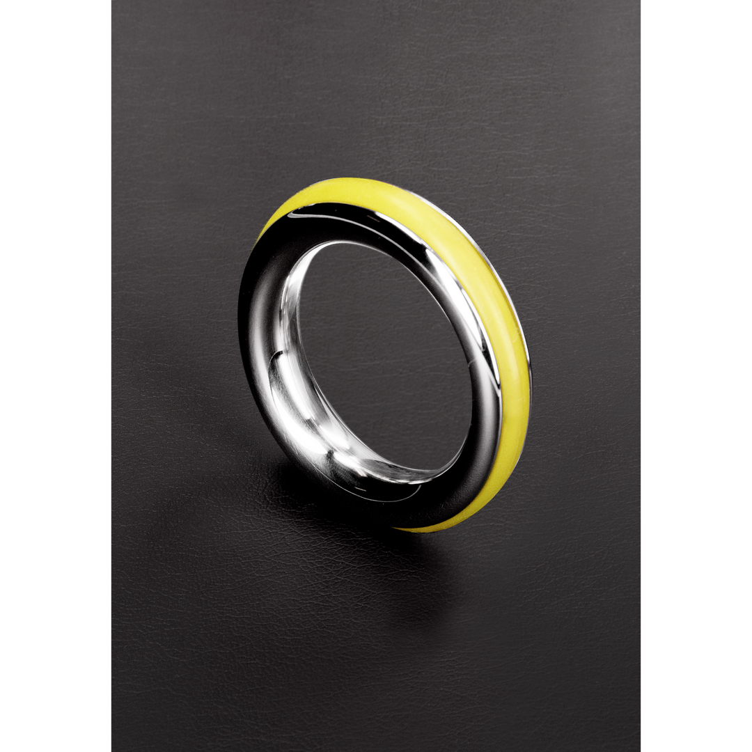 Made from Stainless Steel, this cockring is designed with comfort and style in mind The Cockring has Inlay Silicon Rubber Rings. In the colors: Red, Black, Blue and Yellow. This ring will help prolong your erection and add some flare at the same time.