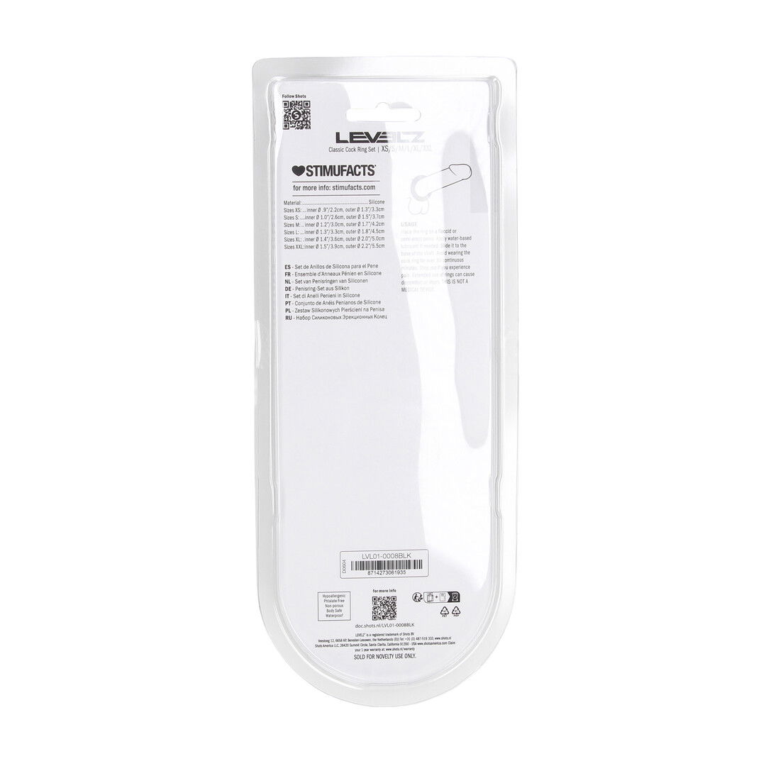 Step up your game with this essential trio from the LEVELZ collection. This non-vibrating set includes three body-safe silicone cock rings in xs, small, medium, large, extra large, xxl and perfect for shaft, cock balls, or stacked wear. Each ring offers a different fit and feel, letting you customize your experience. Packaged in a sleek, merchandisable clamshell for easy display and storage.