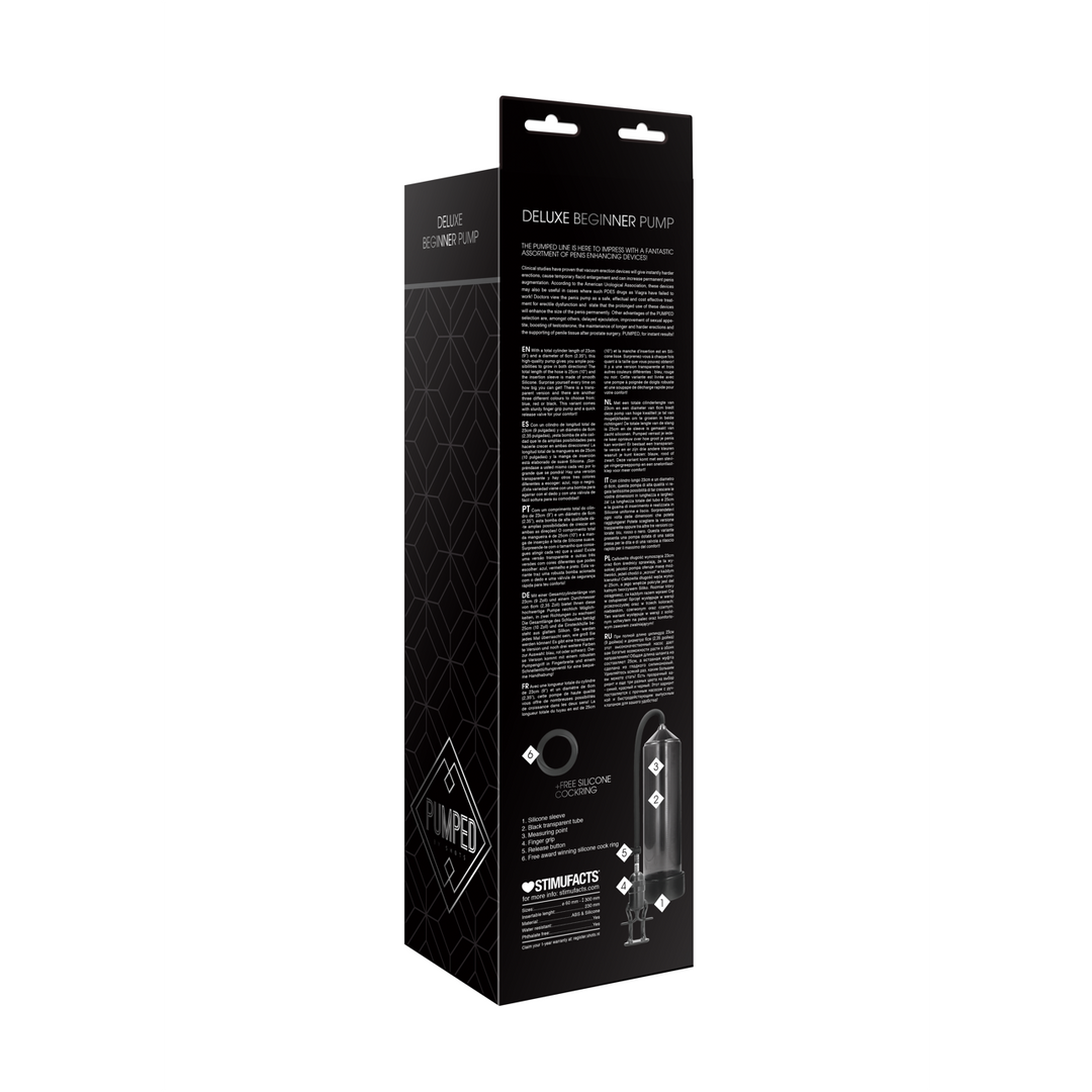 Featuring a reinforced finger grip handle, this pump is ideal for those seeking a firmer hold. Its transparent cylinder provides a clear view during use, and the silicone insertion sleeve ensures a snug fit. The cylinder measures 23 cm in length and 6 cm in diameter. WARNING: Please read product manual before using any type of vacuum pump orconstriction ring. Stop using the devices immediately if you experience any pain or discomfort.
