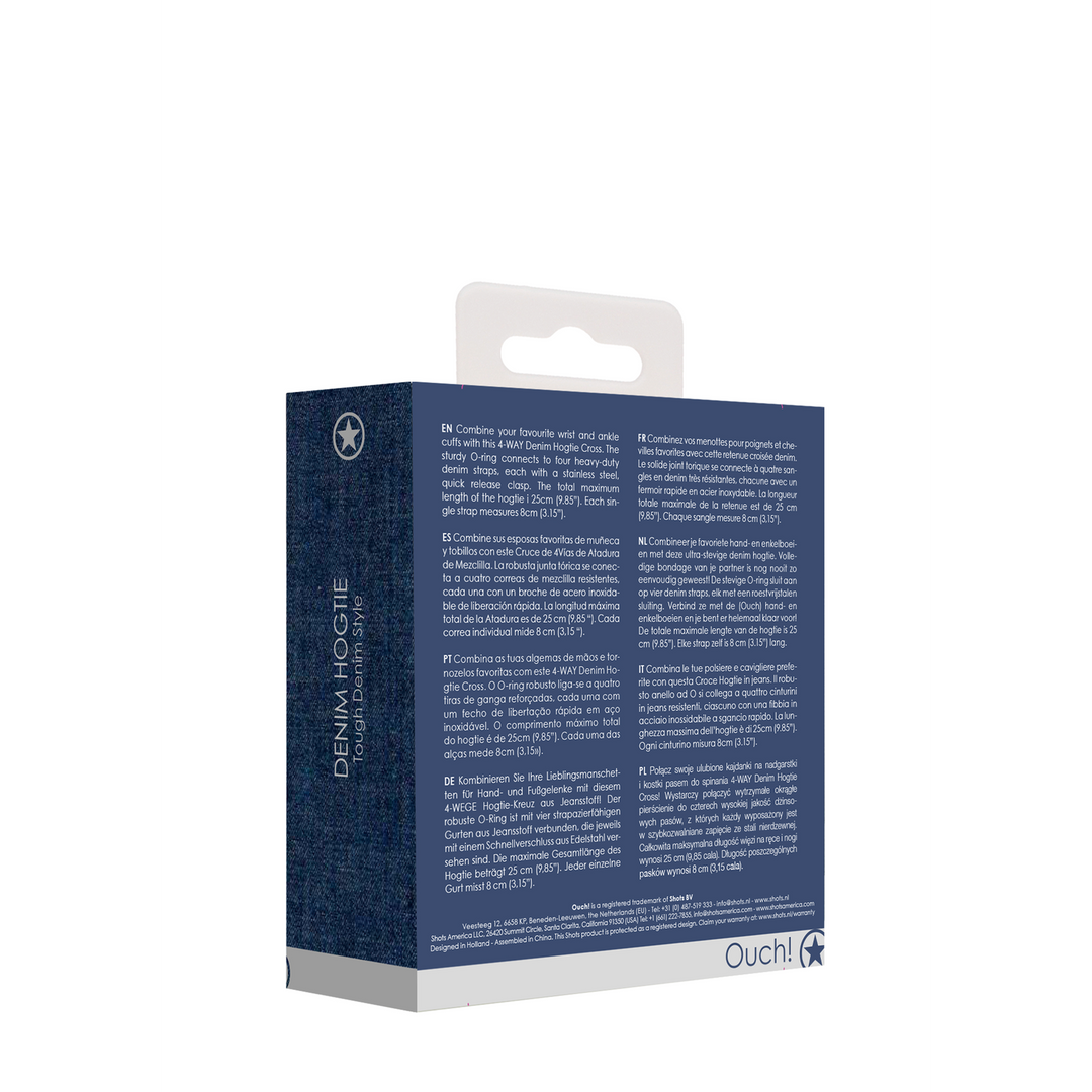 Combine your favourite wrist and ankle cuffs with this 4-WAY Denim Hogtie Cross. Full body restraint has never been so easy, just clip your sub’s arms and legs behind their back, or in front, for total control and submission! This Denim Hogtie will look absolutely amazing in any BDSM, beginners, as well as advanced players, collection! The sturdy O-ring connects to four heavy-duty denim straps, each with a stainless steel, quick release clasp. Just clip them onto (Ouch) hand and ankle cuffs and you’re ready to play. This sturdy fabric will seamlessly blend in with anything you wear during your kinky role play! The popular world of Ouch! Denim will keep your sub secure while looking fiercely fabulous! The total maximum length of the hogtie is 25cm (9.85). Each single strap measures 8cm (3.15).