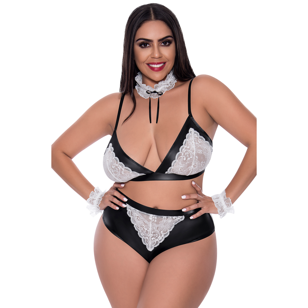 Van de Dress Up-collectie van Magic Silk, deze stijl omvat: een zwart-witte bralette met verstelbare schouderbanden met zilverkleurige sliders en haak- en oogsluitingen aan de achterkant, een kanten kraag met een zwart satijnen strik, kanten polsbandjes en een bijpassende slip.