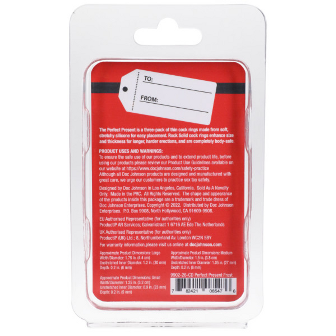 De Perfect Present is een drie-pack van dunne cockringen gemaakt van zacht, rekbaar silicone voor gemakkelijke plaatsing. Rock Solid cockringen verbeteren de grootte en dikte voor langere, hardere erecties en zijn volledig veilig voor het lichaam.