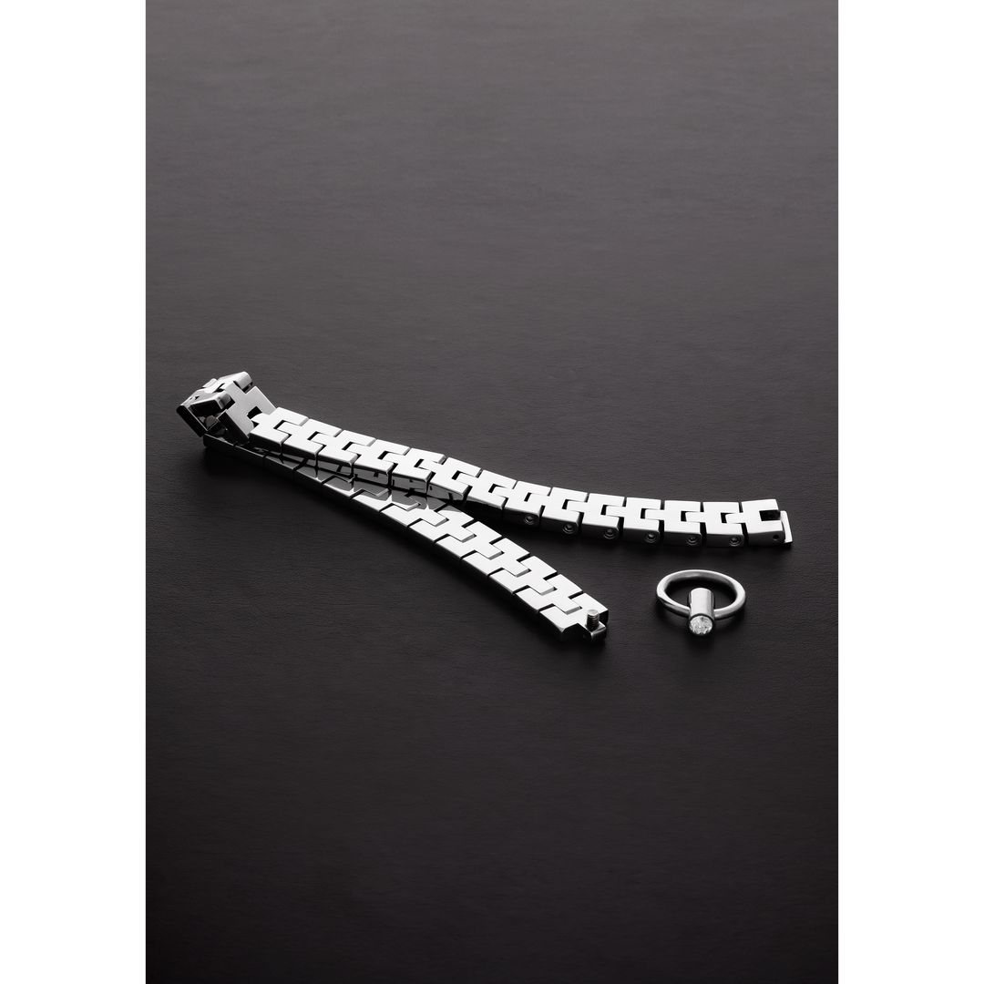 De Horlogeband Halsband heeft een prachtig design met een edelsteen slotje.De totale lengte van deze Horlogeband Halsband is 44,7cm.Door zijn O-ring geeft deze halsband je eindeloos veel mogelijkheden, gebruik gewoon je fantasie.Vervaardigd uit hoogwaardig RVS.Ben je klaar voor wat sterk genot? Geniet van dit speelgoed van ‘Shots Steel’/