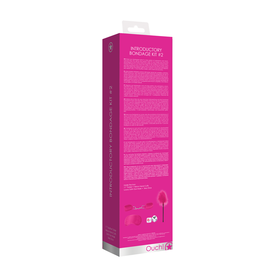 Perfecte bondage kit voor beginnersDe doos bevat alles wat je nodig hebt om je partner te plagen of een extremer rollenspelDeze kit is verkrijgbaar in 4 verschillende kleuren: zwart, roze, paars en roodWordt geleverd met zachte verstelbare fluwelen manchetten, 11 verenkietel, satijnen masker en seksdobbelstenenOntdek je donkere kant/