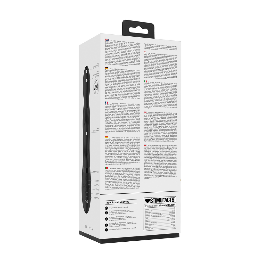 De oplaadbare siliconen 360 graden roterende g-spot rabbit (Niva) met beads en drievoudige stimulaties bevat een 360 graden in vele richtingen, draaiende g-spot tip met 10 standen, een vibrerende tienvoudige functie voor de g-spot en clitorale vibrators met 10 standen. De Niva zal uw diepste verlangens bevredigen. De 3 nieuwe generatie f-1 motoren geven u meer dan 1.000 mogelijke unieke standen om mee te spelen. Het is gemaakt van 100% zijdezachte medische siliconen, 100% waterdicht (ipx7) en extreem stil met minder dan 60db, Wordt geleverd met een magnetische USB oplaadbare lithium-ionbatterij die volledig opgeladen 50 minuten gepassioneerde speeltijd biedt. Met een druk op de climax knop laat u alle motoren onmiddellijk op volle kracht en snelheid draaien en, nog belangrijker, het brengt u naar een wereldschokkend orgasme.