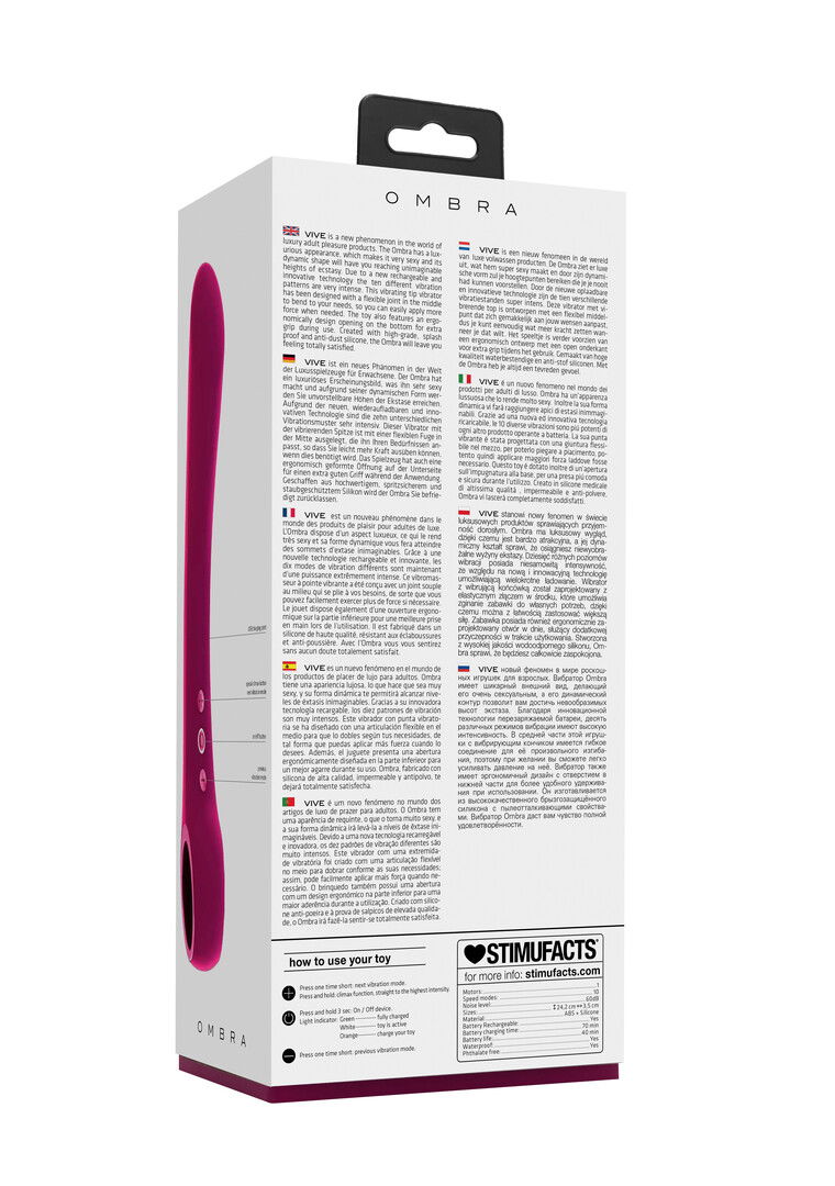 VIVE is een nieuw fenomeen in de wereld van luxueus erotisch ?speelgoed?. De OMBRA heeft een superieure luxe, sexy uitstraling en door zijn dynamische vormgeving staat hij garant voor uren van onvoorstelbare extase! Door een nieuwe oplaadbare en innovatieve technologie zijn de tien verschillende vibratie-patronen uiterst intens. Deze vibrerende ?tip?-vibrator is ontworpen met een flexibel middengewricht om te buigen in iedere gewenste richting zodat je gemakkelijk meer kracht kunt uitoefenen wanneer dat nodig is. Het speeltje heeft ook een ergonomisch ontworpen opening aan de onderkant voor extra grip tijdens gebruik. Gemaakt van hoogwaardige, spatwaterdichte en zijdezachte siliconen, geeft de OMBRA altijd en overal volledige bevrediging!
