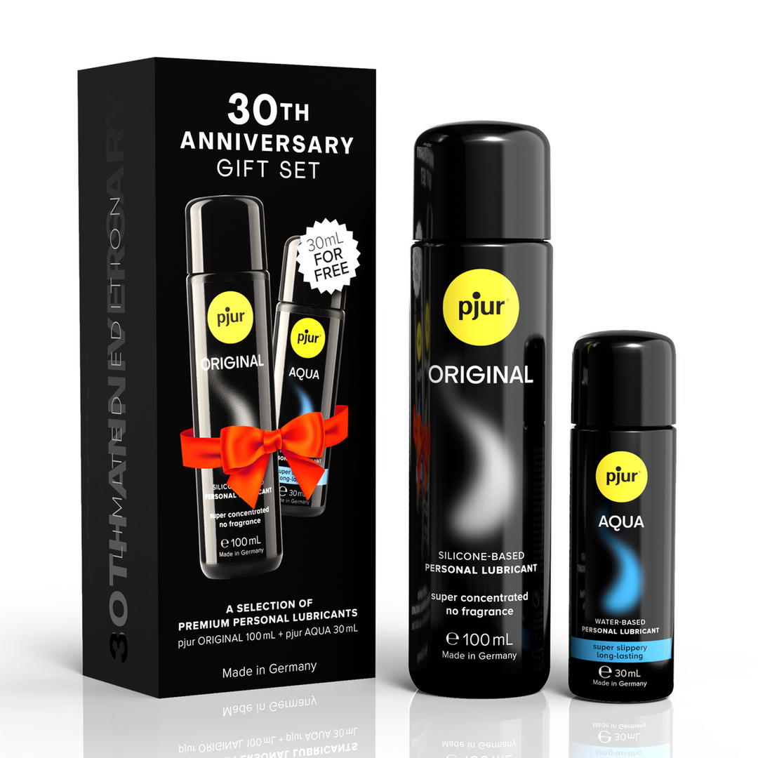30 years of Pjur. 30 years of passion, trust and quality. To celebrate our anniversary, we’ve created something truly special: pjur ORIGINAL (100 ml) meets pjur AQUA (30 ml) which comes for free. Two classics combined in one set for unforgettable moments of closeness, intimacy and pleasure. 30 ml Pjur AQUA free, perfect for testing. Water-based lubricant ideal for use with sex toys. Silicone-based lubricant for long-lasting pleasure and sensual massages. Celebrate 30 years of pjur with this limited-edition gift set, made for everyone who wants to experience true quality. Pjur ORIGINAL gives you a silky-smooth sensation that lasts whether during sex or a sensual massage. And with the 30 ml bonus of pjur AQUA, you can also discover a premium water-based lubricant, perfect for your favourite toys. Whether you’re a long-time fan or new to the world of pjur, this set lets you experience what true premium quality feels like. Because: Quality Always Wins. Silicone- and water-based personal lubricant to relieve vaginal dryness. Suitable for use with condoms. Increases comfort during sex.