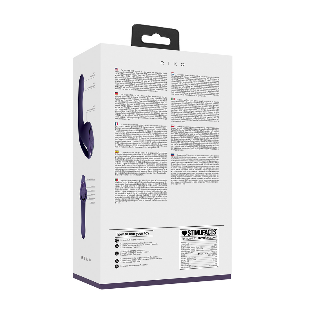 De VIVE058 RIKO vibrator is een klasse beter dan de concurrentie. Drie onafhankelijk bestuurde New Generation F1 10 snelheid/functie motoren geven deze prachtig ontworpen vibrator kracht. Er is een motorfunctie voor G-spot vibratie, een Come-hither INNER G-spot stimulerende motor en een clitorale Pulse wave stimulator motor die je zal helpen om overweldigend genot te ervaren. Met meer dan 1000 verschillende combinaties zal dit speeltje je naar plaatsen brengen die je nooit voor mogelijk had gehouden. Wanneer je dicht bij de climax komt, zal één aanraking van de speciale functie climaxknop alle motoren onmiddellijk op volle kracht/snelheid brengen. De volledig USB magnetisch oplaadbare medische siliconen vibrator heeft een batterijduur van 60 minuten en is volledig waterdicht (IPX6), wat betekent dat je dit speeltje overal kunt gebruiken. Alle VIVE vibrators worden geleverd met een garantie van 1 jaar.