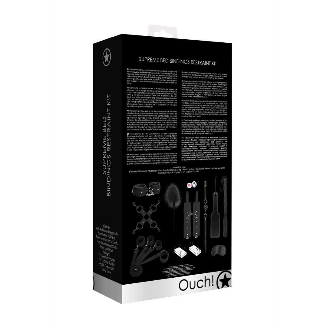 Maak van je slaapkamer de ultieme bondage speeltuin met de beste onder het bed vast te maken bedwangkit. Geen speciale opstelling nodig, alleen een matras en uw enthousiaste geliefde. Wordt geleverd met 4 hoge kwaliteit bevestigingen, ademende ball gag, pluche lederen handen beenboeien, satijnen oogmasker, 12 inch gebonden lederen paddle, flogger, 11 inch feather met veren, hogtie connector en seksdobbelstenen.