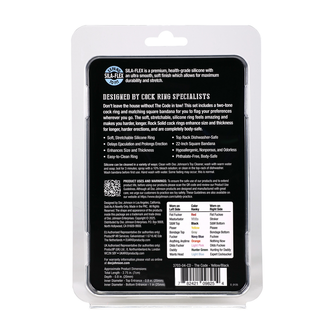 Verlaat het huis niet zonder The Code! Deze set bevat een twee-kleurige cockring en een bijpassende vierkante bandana zodat je overal je voorkeuren kunt tonen. De zachte, rekbare siliconen ring voelt geweldig aan en zorgt ervoor dat je harder en langer bent. Rock Solid cockringen vergroten de grootte en dikte voor langere, hardere erecties en zijn volledig veilig voor het lichaam.