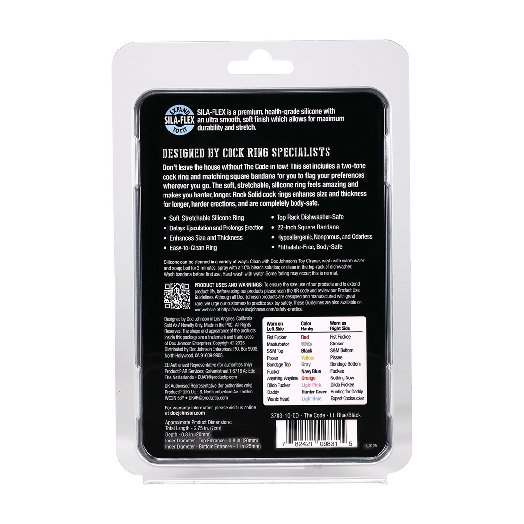 Verlaat het huis niet zonder The Code! Deze set bevat een twee-kleurige cockring en een bijpassende vierkante bandana zodat je je voorkeuren overal kunt laten zien. De zachte, rekbare siliconen ring voelt geweldig aan en zorgt ervoor dat je harder en langer bent. Rock Solid cockringen verbeteren de grootte en dikte voor langere, hardere erecties en zijn volledig veilig voor het lichaam.