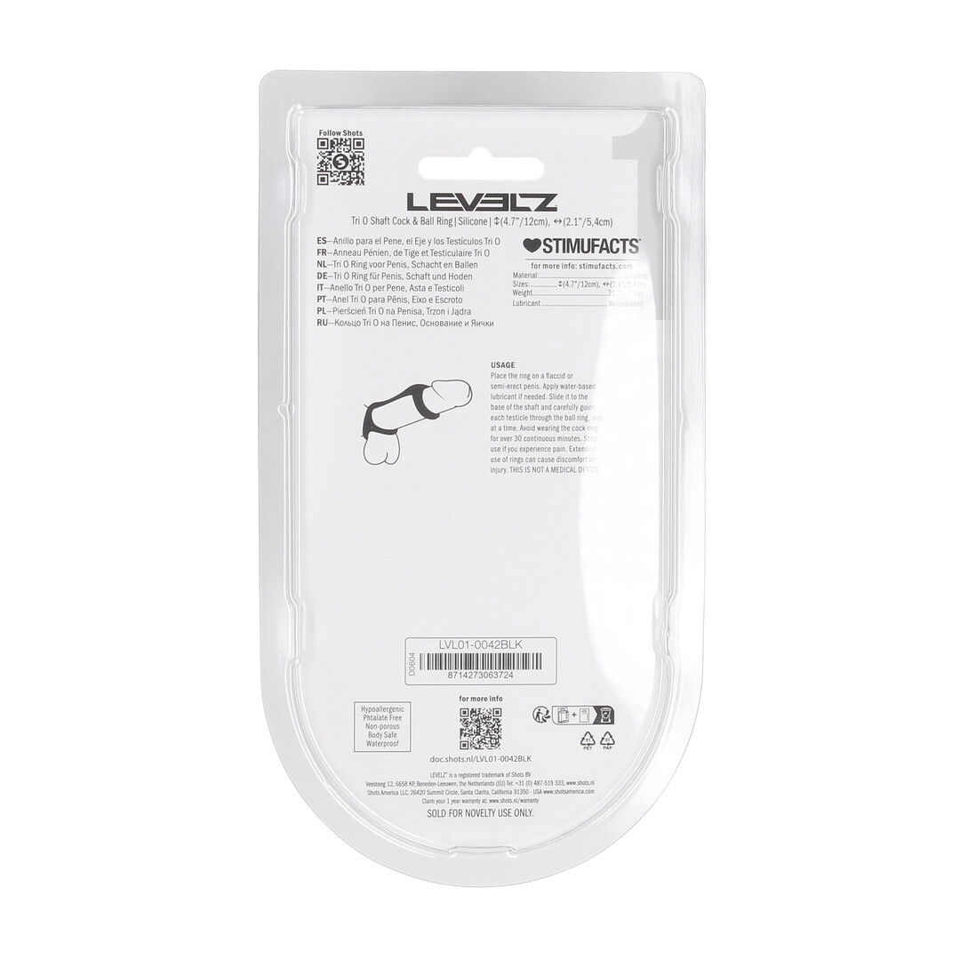 This Tri-O design from the LEVELZ collection features three connected loops: one for the shaft, one for the cock balls, and an additional stabilizing ring for a secure, full-package fit. Crafted from smooth, body-safe silicone, this non-vibrating harness-style ring enhances pressure, control, and visual appeal. Packaged in a sleek clamshell for bold retail impact.