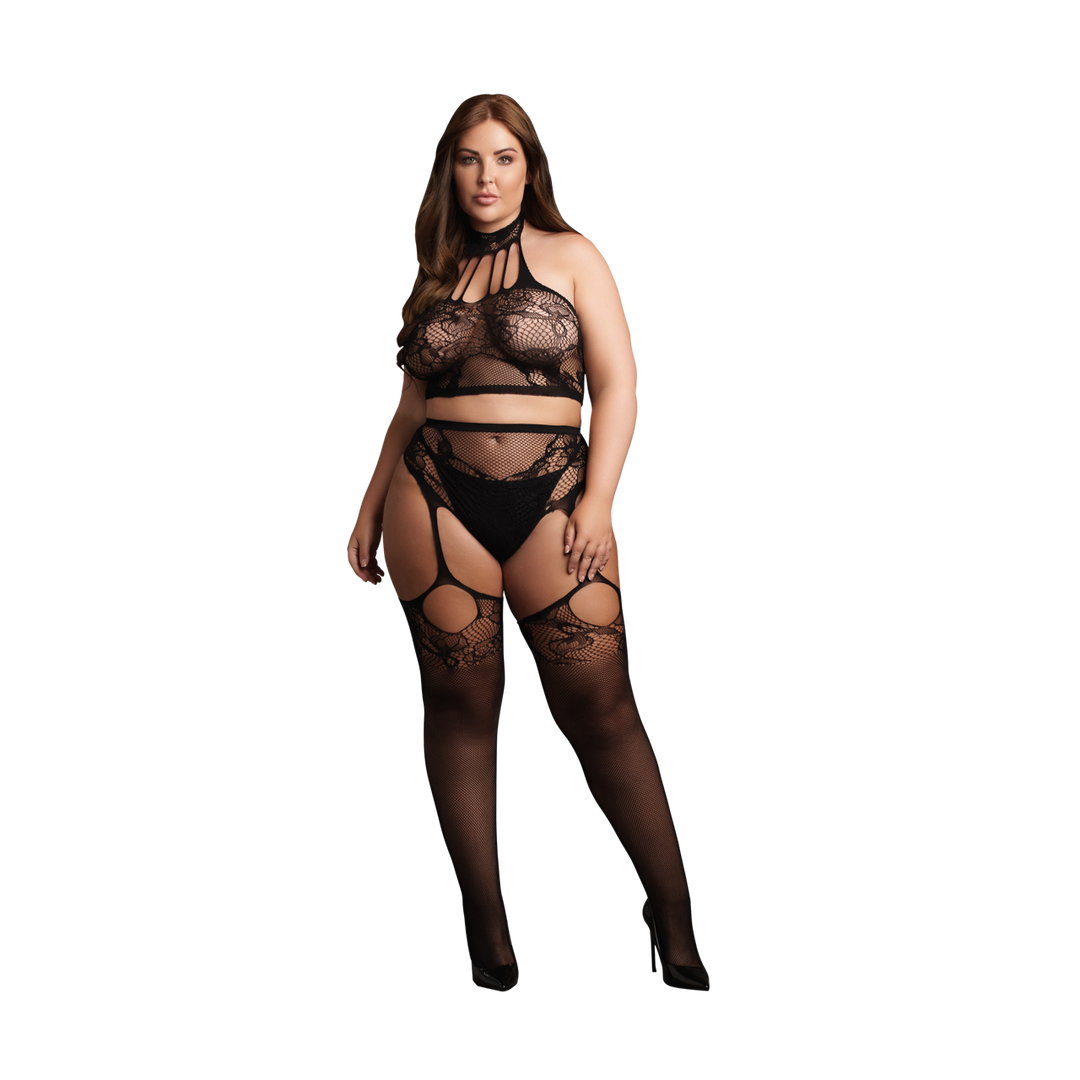 Haltertop met slipje en aangehechte kousen. Prachtige combinatie van kantpatroon en visnet, die het lichaam accentueert. De zachte super rekbare stof past in de maten XL tot 4XL.