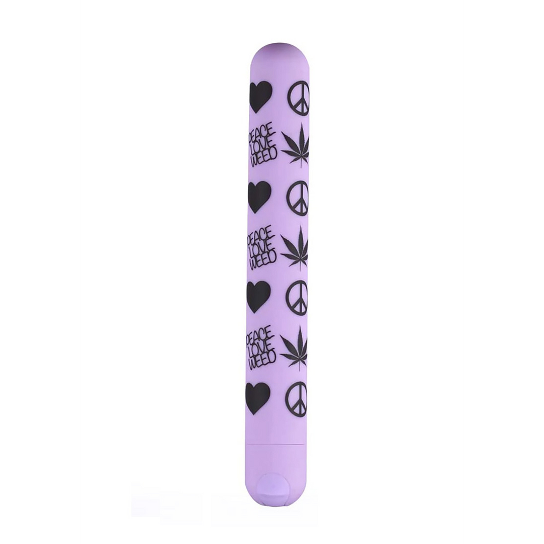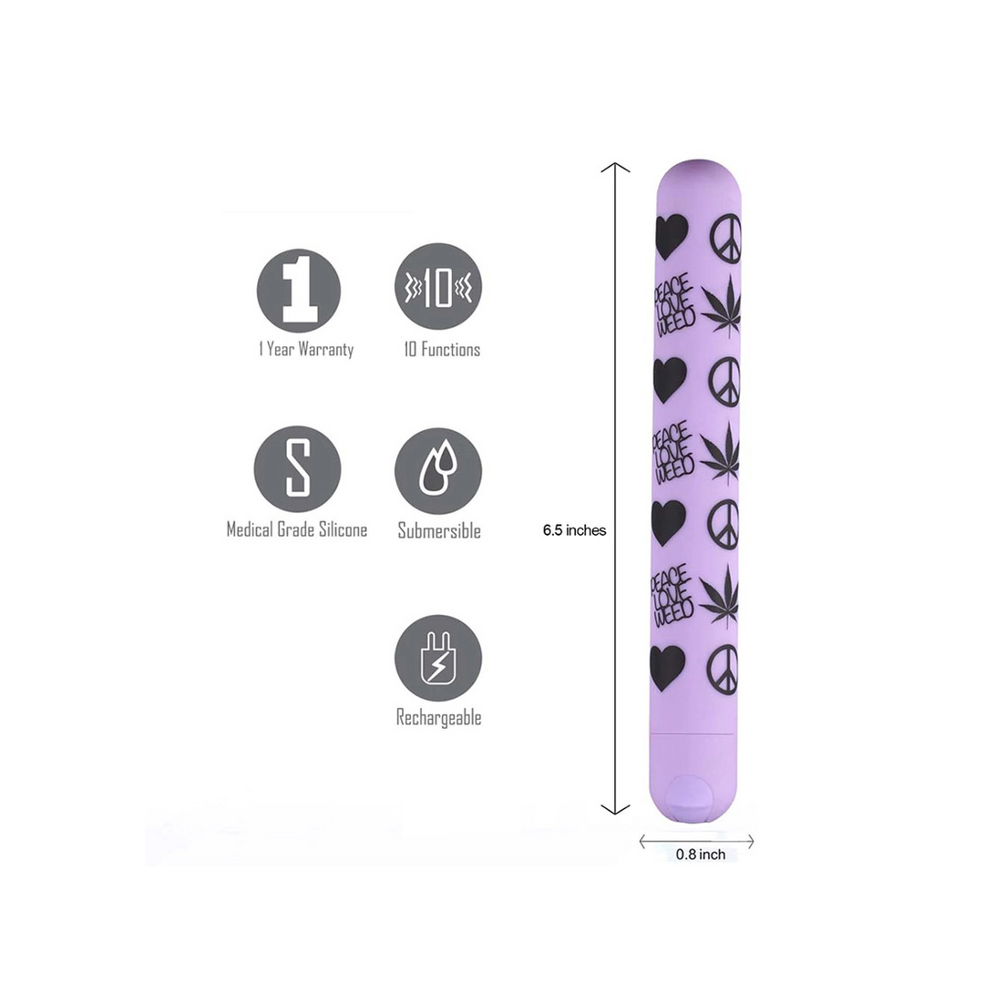 PEACE, LOVE and WEED. The Maia Novelties Unity makes a timeless statement with its modern design and nostalgic look. This 10-Function Rechargeable Bullet Vibrator is coated with silky soft Silicone that is 100% body safe. The PEACE, LOVE and WEED print design belies a soft yet powerful motor. The long, slender design allows for easy handling and multiple uses while the end position control button allows for easy speed change. Our Unity can also be used for bath time highs with its 100% submersible design.The Maia Novelties Unity measures 6 inches in length and is app. ¾ inches wide and includes a USB Charging Cable. All our rechargeable products include our 1-Year Replacement Warranty.
