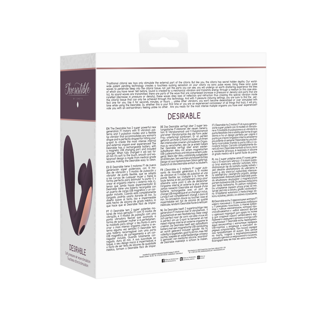 De Desirable heeft een superkrachtige new generation F1 motor met 10 vibratiemodi en een flexibele kop. Deze voegt zich perfect naar de vorm van elke vrouw en is perfect om uw G-spot te beroeren en het meest intense interne en externe orgasme te creëren. De Desirable heeft een oplaadbare batterij met een magnetische USB-aansluiting en wordt geleverd inclusief oplader. Als hij volledig is opgeladen, gaat hij 60 min. mee. Het zachte, soepele en waterbestendige ontwerp is gemaakt van medische silicone, waardoor de Desirable makkelijk is schoon te maken.