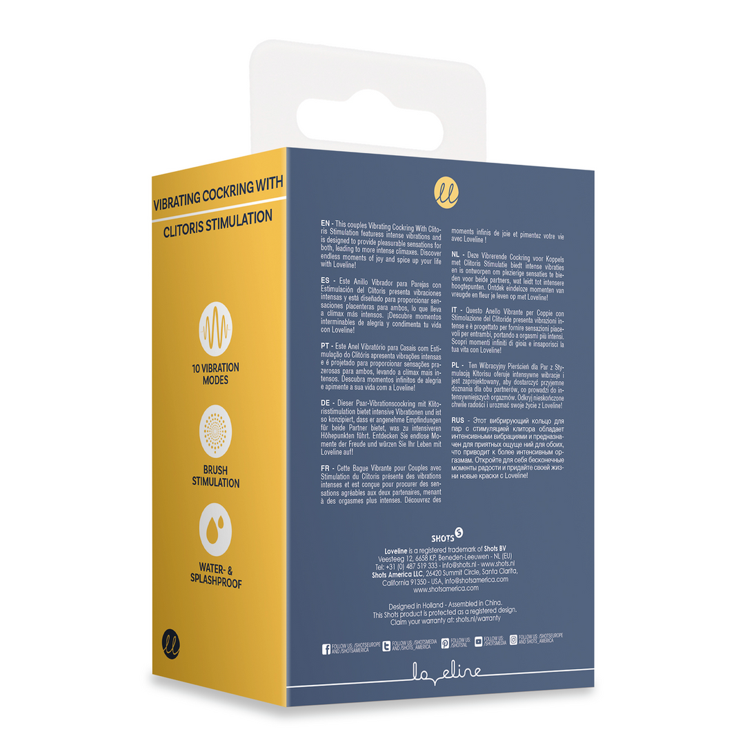 Deze vibrerende cockring voor koppels met clitorisstimulatie heeft intense trillingen en is ontworpen om plezierige sensaties te bieden voor beiden, met een gevoelige borstel die tegelijkertijd de testikels en de clitoris stimuleert, wat leidt tot intensere hoogtepunten. Ontdek eindeloze momenten van vreugde en geef wat extra pit aan je leven met Loveline!