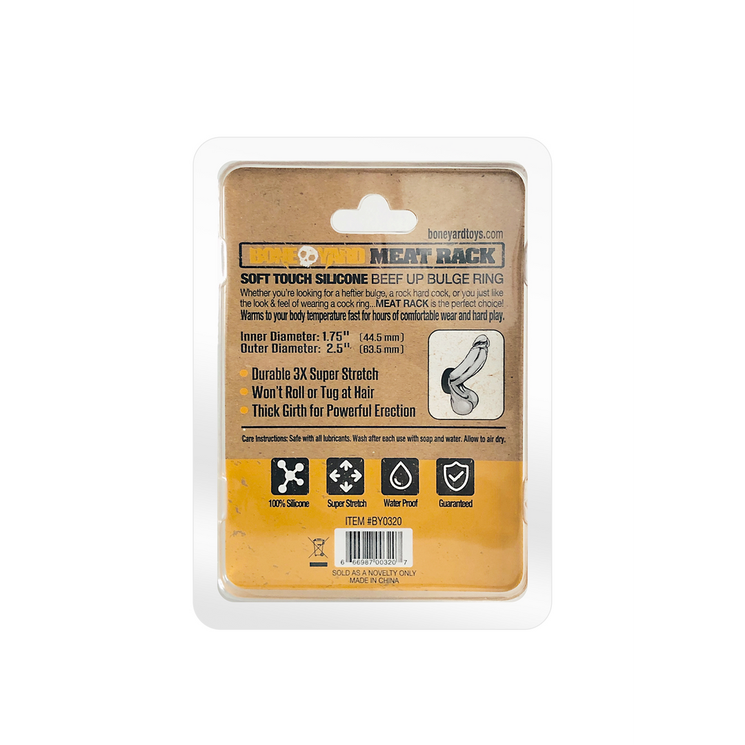 The Meat Rack – Deze vlezige cockring is gemaakt van 100% super rekbare siliconen. Het vleesrek is gemaakt voor comfort en duurzaamheid, voelt zacht aan en rolt niet. De dikke singel zorgt voor een krachtigere erectie. De 3X stretch zorgt ervoor dat 1 maat over een lul, ballen of beide kan worden gebruikt. Het vleesrek is verkrijgbaar in zwart, blauw, rood en geel. 100% siliconen 3X rekbaar ontwerp zonder rollen. Dikke singel voor een krachtigere erectie Grootte Binnendiameter is 1,75 inch (44,5 mm) Buitendiameter is 2,5 inch (63,5 mm) Onderhoudsinstructies – Veilig met alle smeermiddelen . – Na gebruik wassen met water en zeep of schoonmaken in de bovenste plank van de vaatwasser zonder hitte. – Laat aan de lucht drogen.