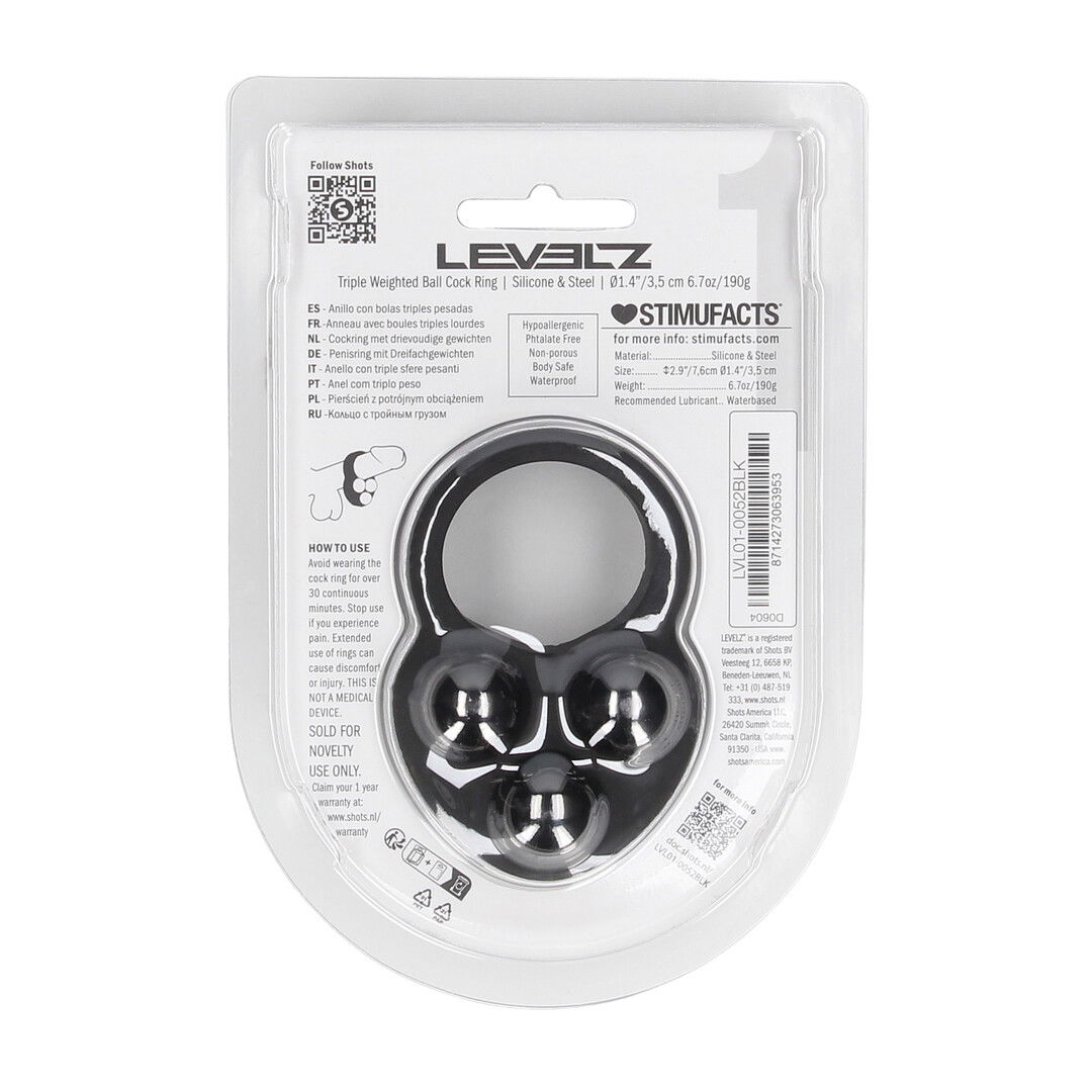 Level up with added intensity. This triple weighted cock ring from the LEVELZ collection combines the firm grip of premium silicone with an internal weight for extra pressure and a more grounded, full-bodied feel. Perfect for users who crave that satisfying tug during wear. Non-vibrating, body-safe, and packaged in a sleek clamshell for easy display.